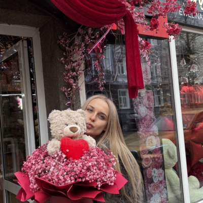Flowerbox z czerwoną gipsówką i misiem