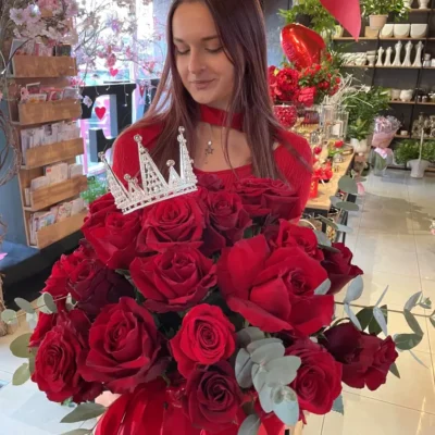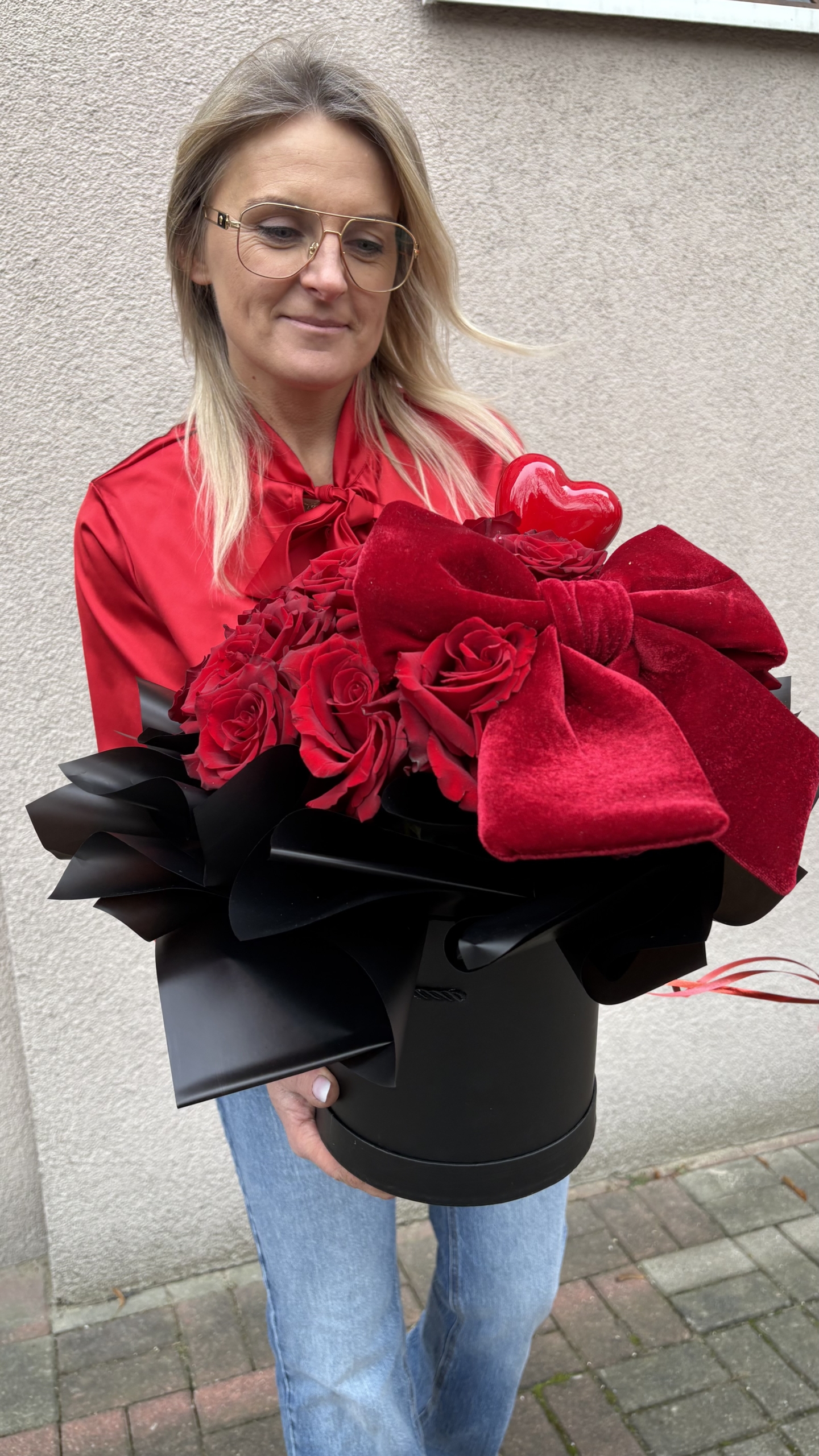 Flowerbox z 25 czerwonych róż z welurową kokardą i serduszkiem. Klasa Premium,box XL