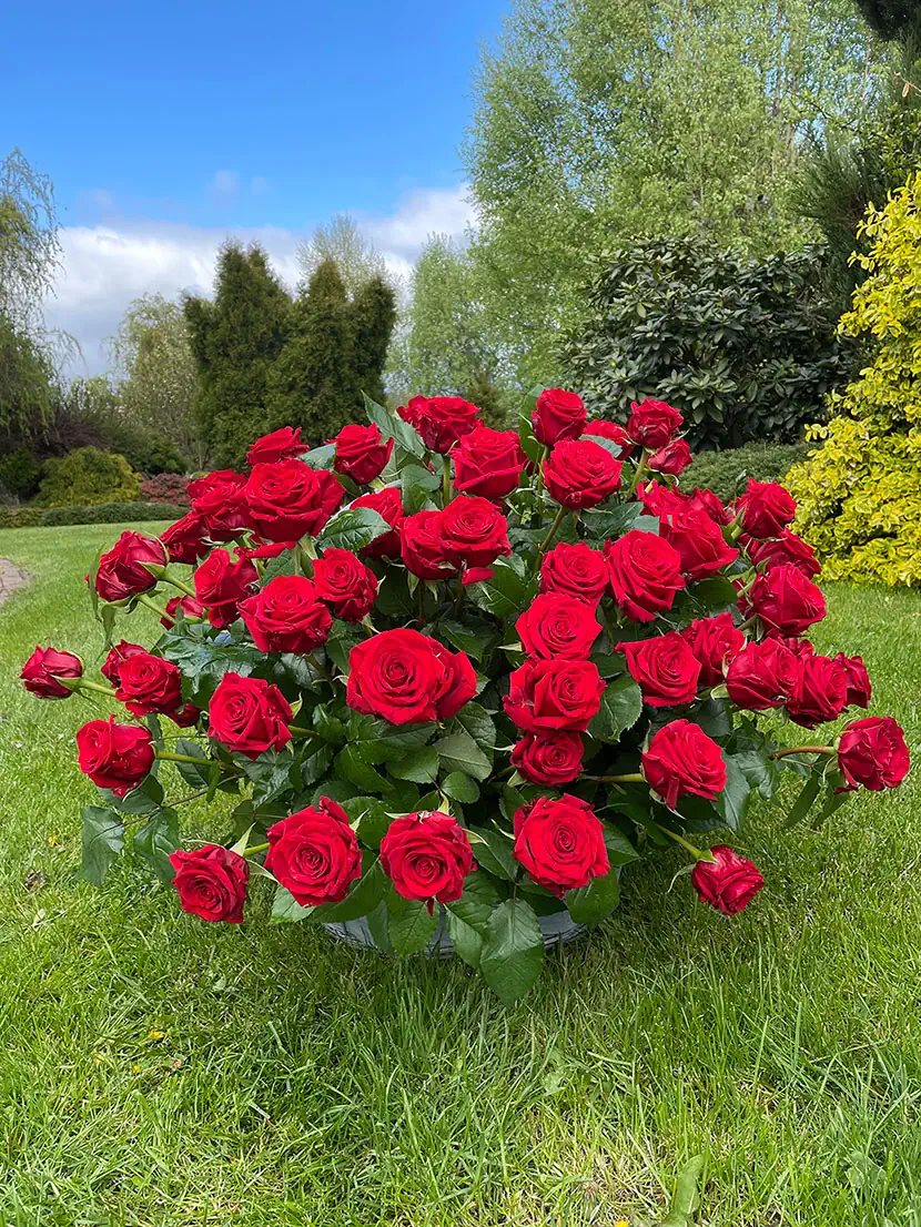 Kosz 101 czerwonych róż w koszu wiklinowym, opcja Premium