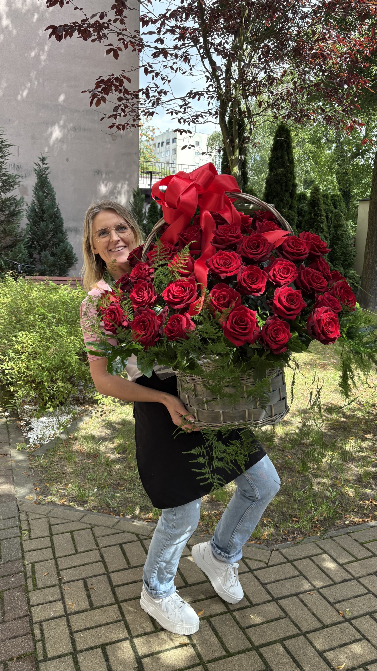 Kosz z 50 czerwonymi różami i zielenią, rozmiar XXL(wysokość około 100cm)